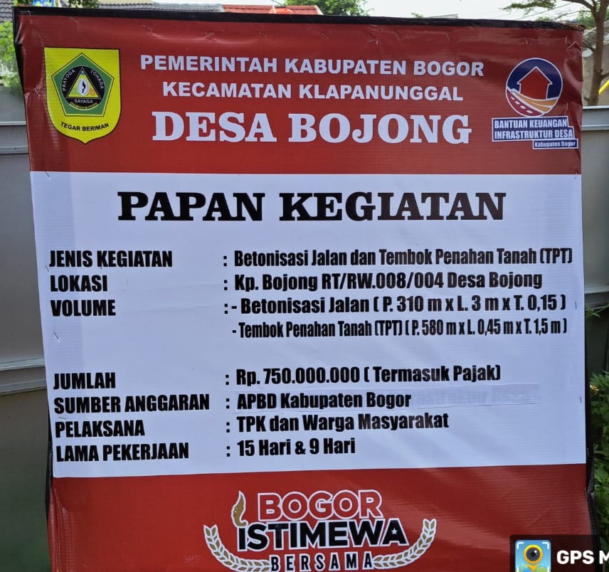 Bogor, mitrapolri info-.Pemerintah Desa Bojong, Kecamatan Klapanunggal, Kabupaten Bogor, merealisasikan pembangunan infrastruktur desa melalui kegiatan betonisasi jalan lingkungan dan pembangunan Tembok Penahan Tanah (TPT) yang berlokasi di Kampung Bojong RT 008/RW 004.