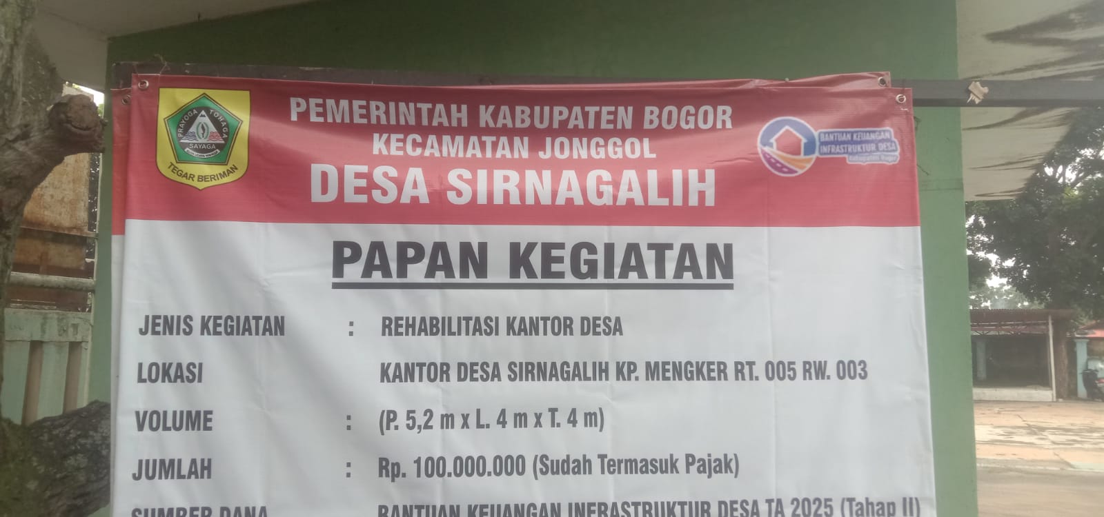 Pemerintah Desa (Pemdes) Sirnagalih, Kecamatan Jonggol, Kabupaten Bogor, Jawa Barata, realisasikan program Bantuan Keuangan Infrastruktur Desa ( BKID ) untuk pembangunan Rehabilitasi Kantor Desa , yang berlokasi di Kampung Mengker RT 005 RW 003, dengan Volume 5,2 M X L 4=M,T .4.M dengan nilai anggaran sebesar Rp 100.000.000; ( Termasuk Pajak ) yang di kerjakan oleh Tim Pelaksana Kegiatan (TPK) dan masyarakat