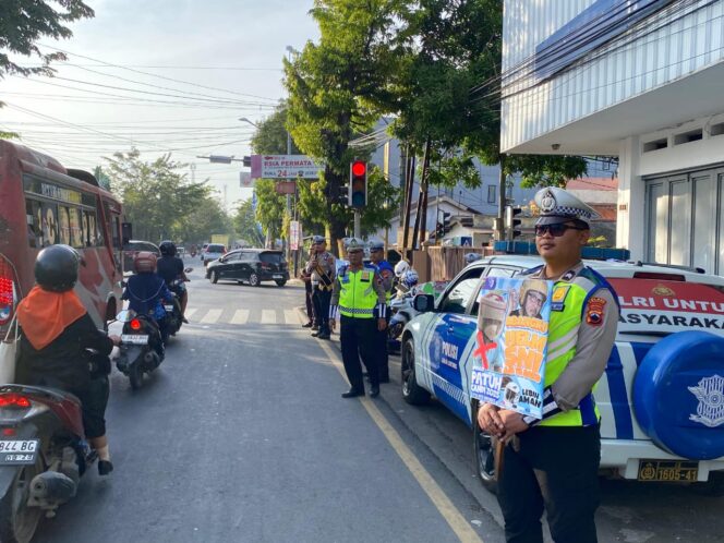 Dalam kegiatan tersebut, petugas membentangkan spanduk sosialisasi dan menyampaikan edukasi secara langsung kepada para pengendara kendaraan bermotor. Mereka memberikan imbauan pentingnya tertib berlalu lintas sebagai bagian dari upaya menciptakan keselamatan di jalan raya menuju Indonesia Emas 2045.