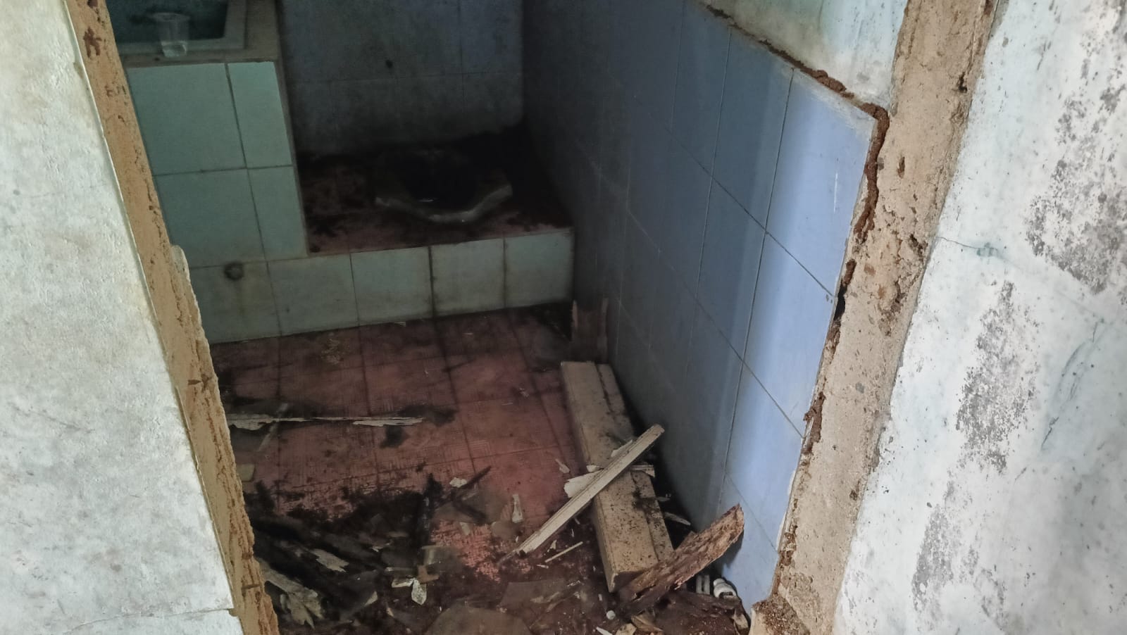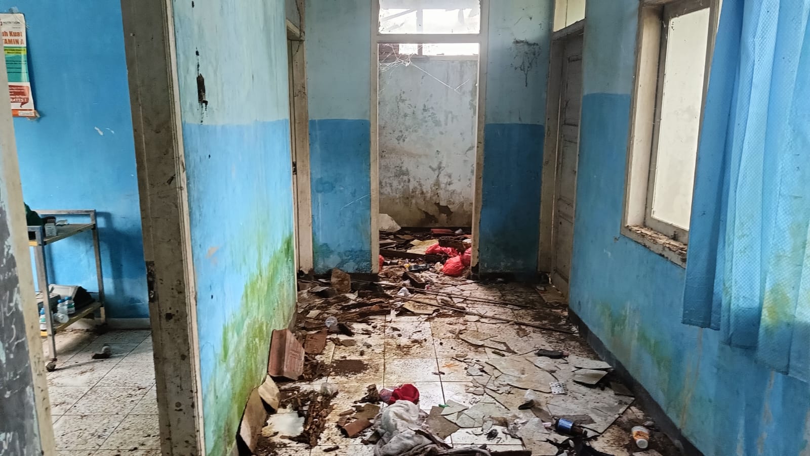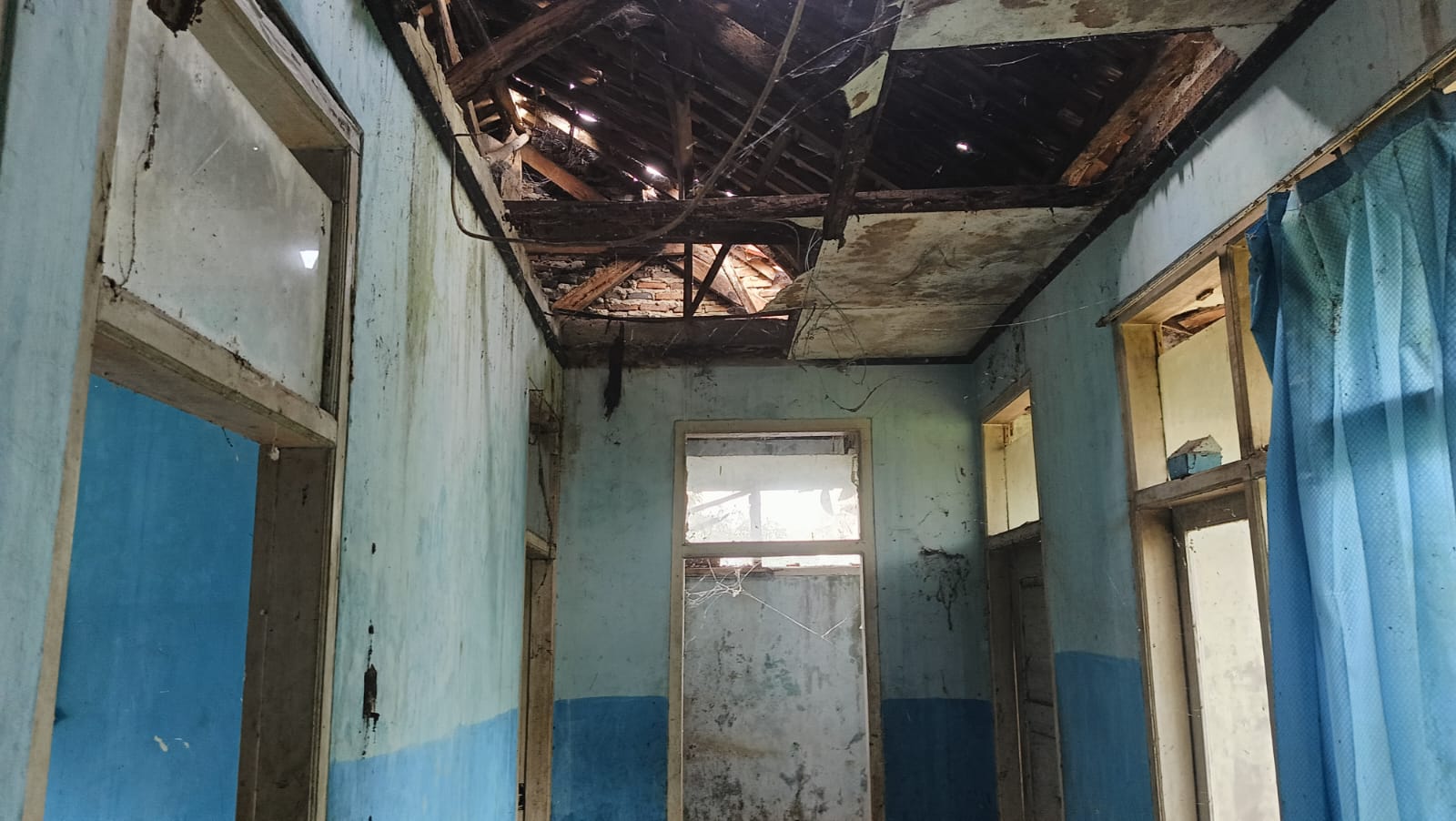 Pantauan di lokasi menggambarkan kondisi yang cukup memprihatinkan. Dinding bangunan terlihat keropos, atap mengalami banyak kebocoran, serta bagian konstruksi kayu tampak rapuh akibat termakan usia. Situasi di dalam ruangan bahkan lebih berat: atap berlubang lebar, rangka kayu patah, genteng hilang, dan plafon jebol di beberapa titik hingga materialnya kerap berjatuhan.