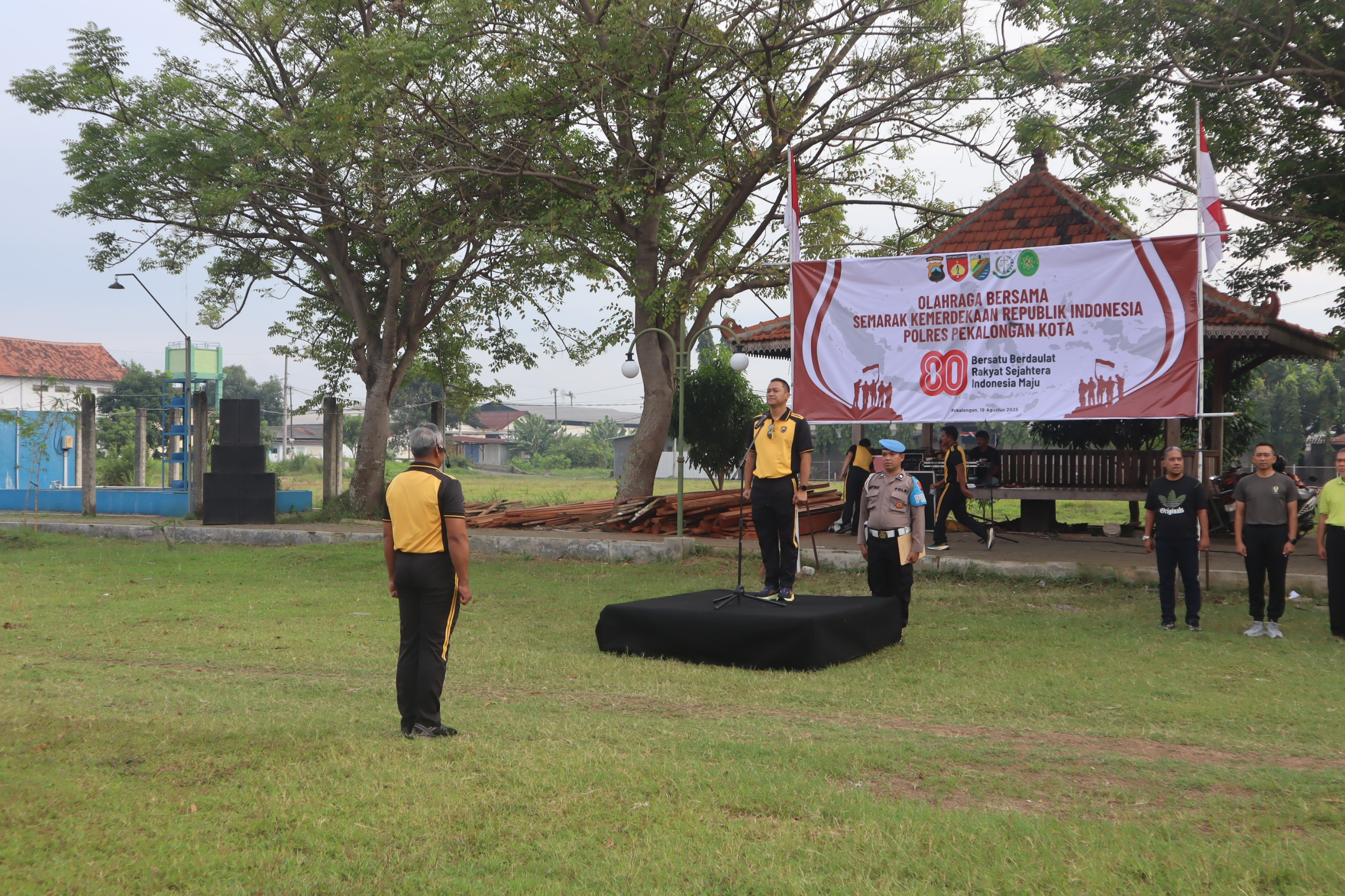 Semarak Hari Ulang Tahun (HUT) ke-80 Kemerdekaan Republik Indonesia, Kepolisian Resor Pekalongan Kota menggelar olahraga bersama di lingkungan Pondok Pesantren (Ponpes) Al Maliki, Kelurahan Jenggot, Kecamatan Pekalongan Selatan, Selasa (19/8/2025).